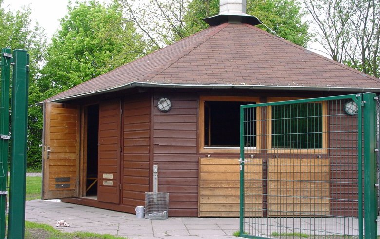 Toiletten sind im Nebengebäude untergebracht. Hier befindet sich auch ein Kraftstrom- und Wasseranschluss für das Geschirrmobil.