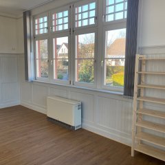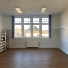 • Es wurde eine neue Decke ca. 5 cm unterhalb der bestehenden Decke eingezogen. Ziel dieser Maßnahme war es, die Unebenheiten der alten Decke auszugleichen, spätere Rissbildungen zu vermeiden, die Verlegung neuer Elektroleitungen und Leuchten zu ermöglichen und das Erscheinungsbild des Raumes zu optimieren. Die Decken- und Farbgestaltung wurde mit der Unteren Denkmalschutzbehörde abgestimmt.