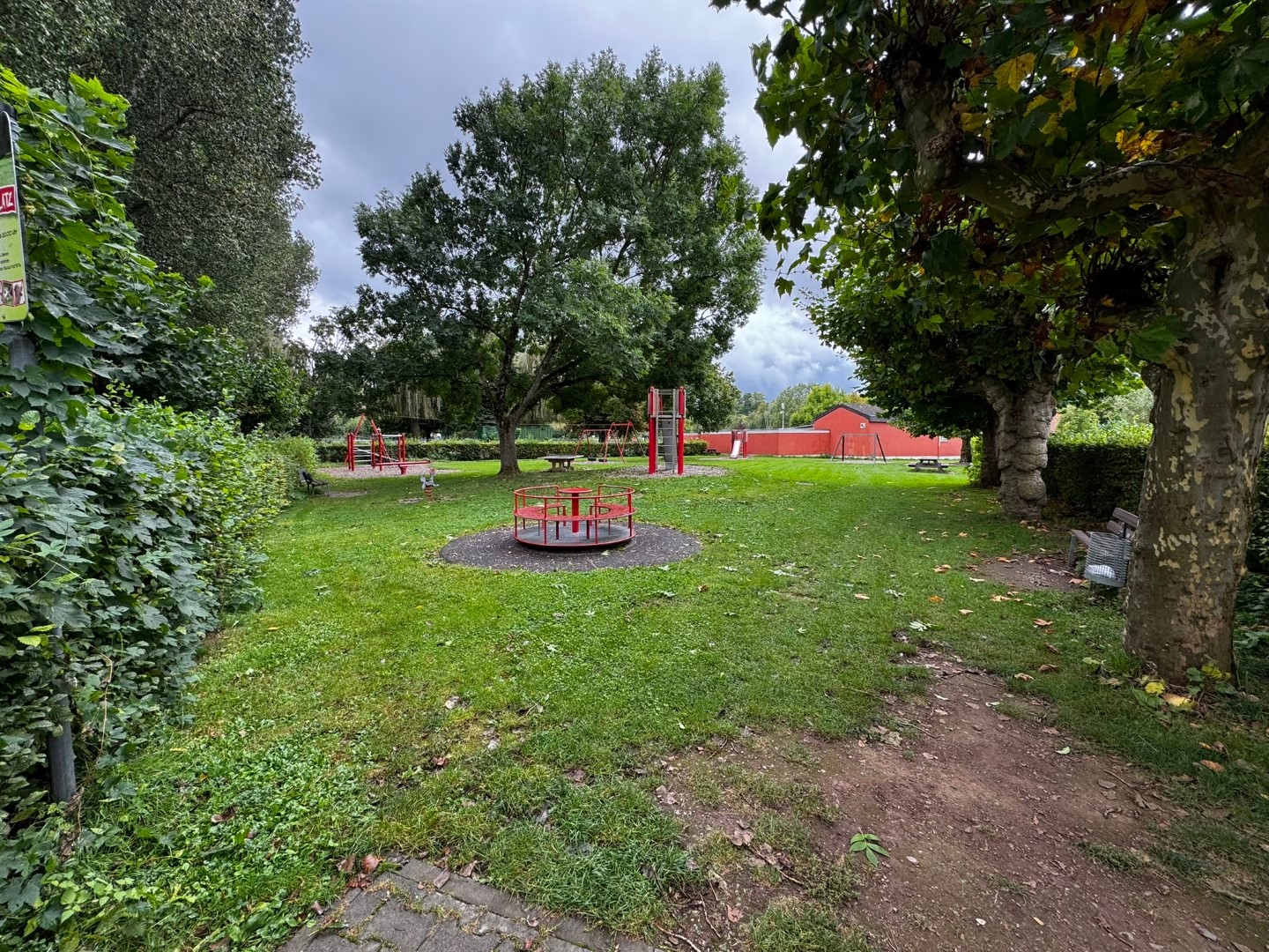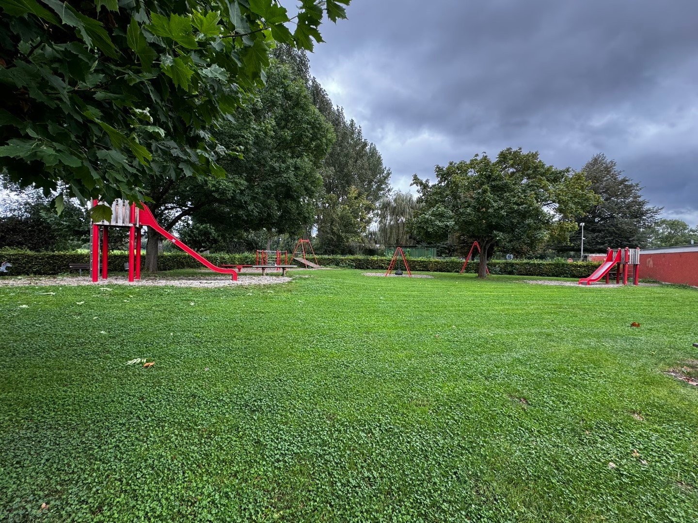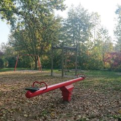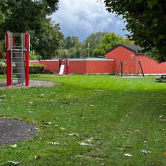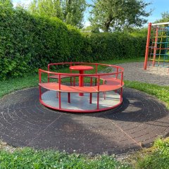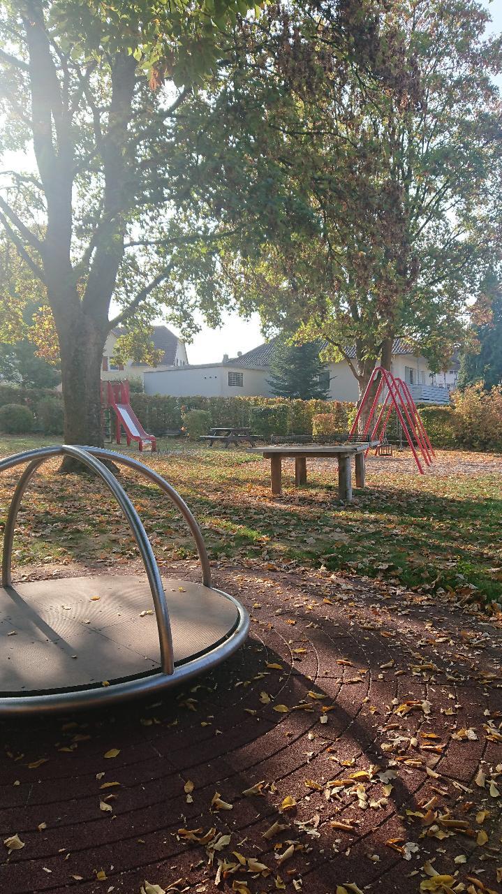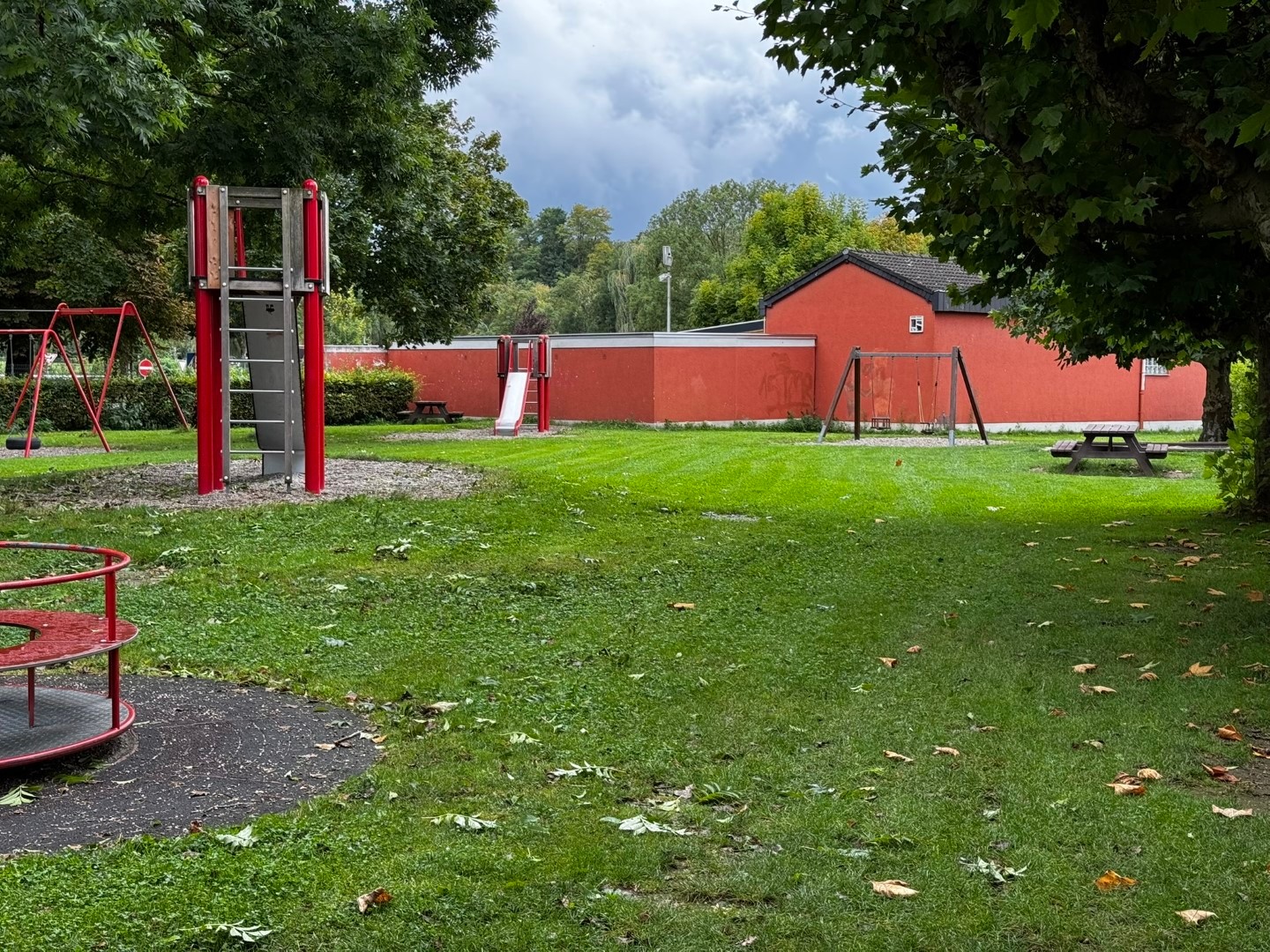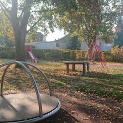 Ausstattung: Sandkasten, Seilbahn, Tischtennisplatte, Schaukel, Schwingtier, Reck, Karussell