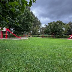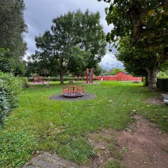 Ausstattung: Schwingtiere, Sitzgruppe, Sandkasten, Schaukel, Turmrutschbahn, Tischtennisplatte, Karussell