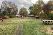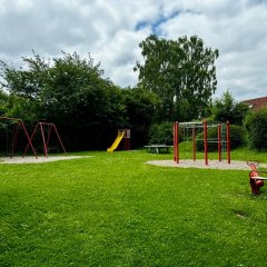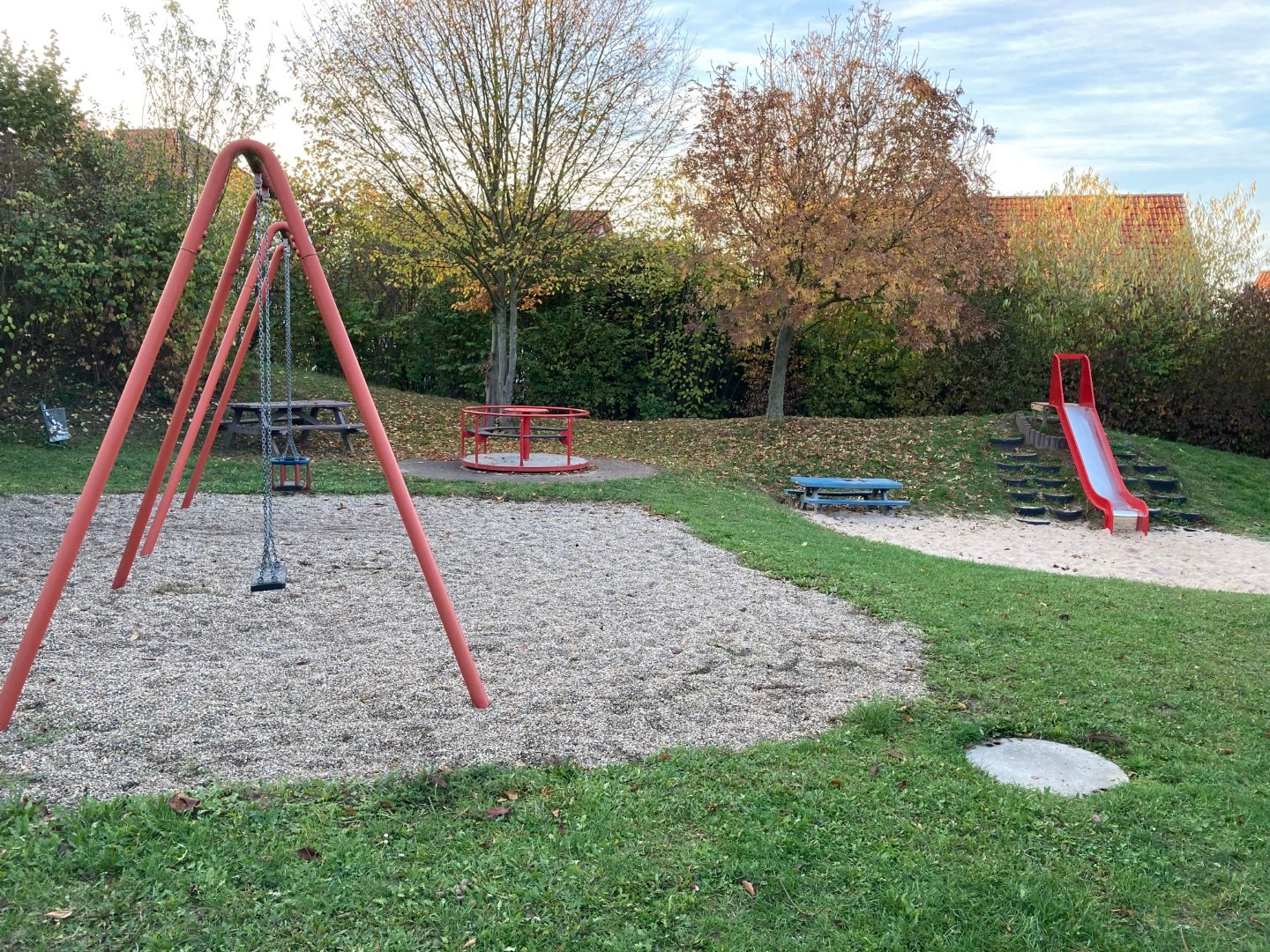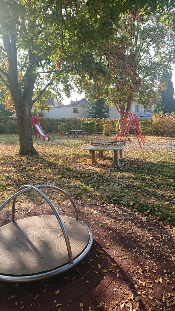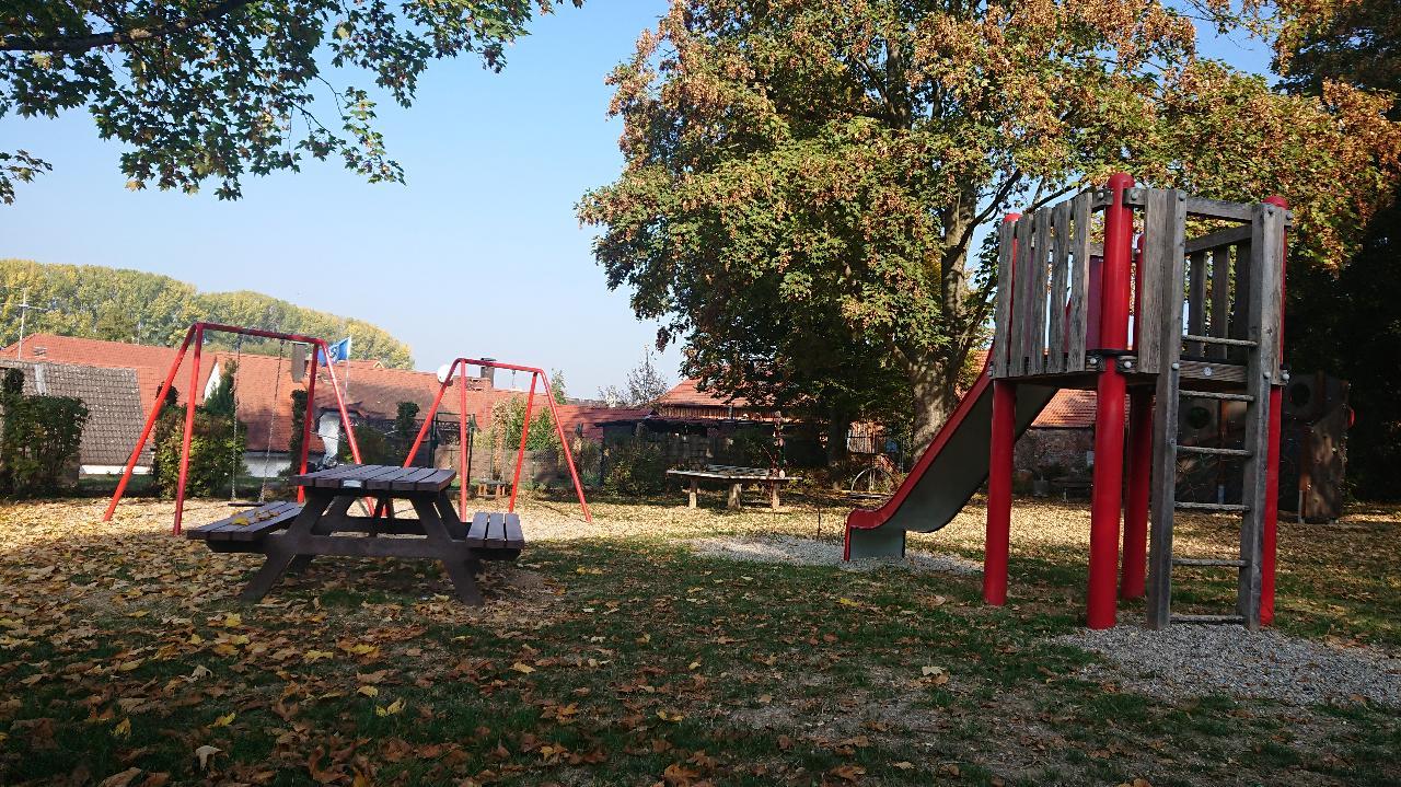 Ausstattung: Sitzgruppe, Sandkasten, Ruschbahn, Tischtennisplatte, Schaukel, Karussell