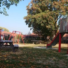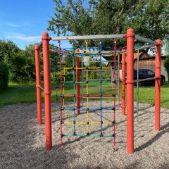 Ausstattung: Schaukel, Sandkasten, Sitzgruppe, Klettergerät, Turmrutschbahn, Schaukel klein, Tischtennisplatte, Wippe
