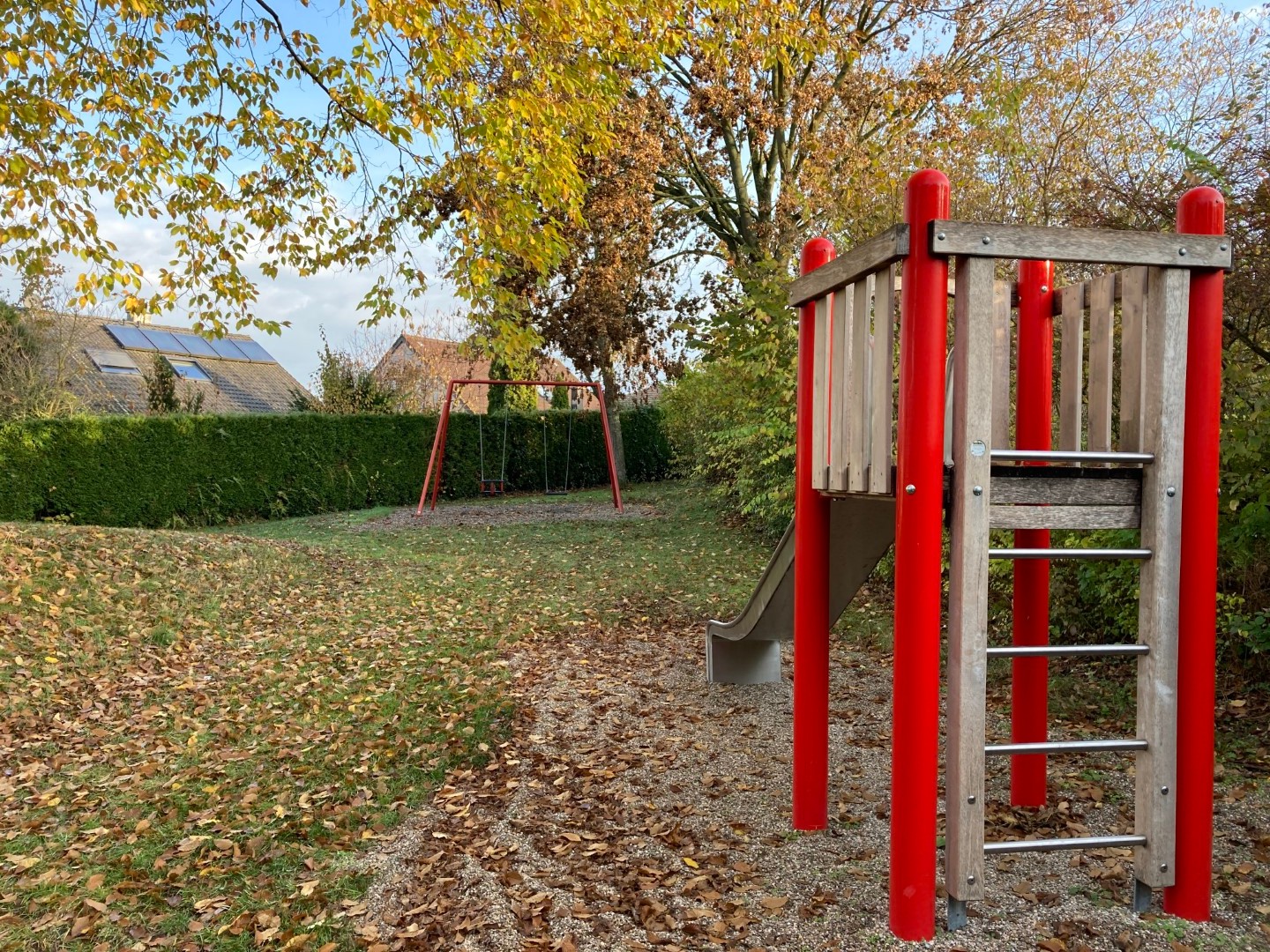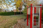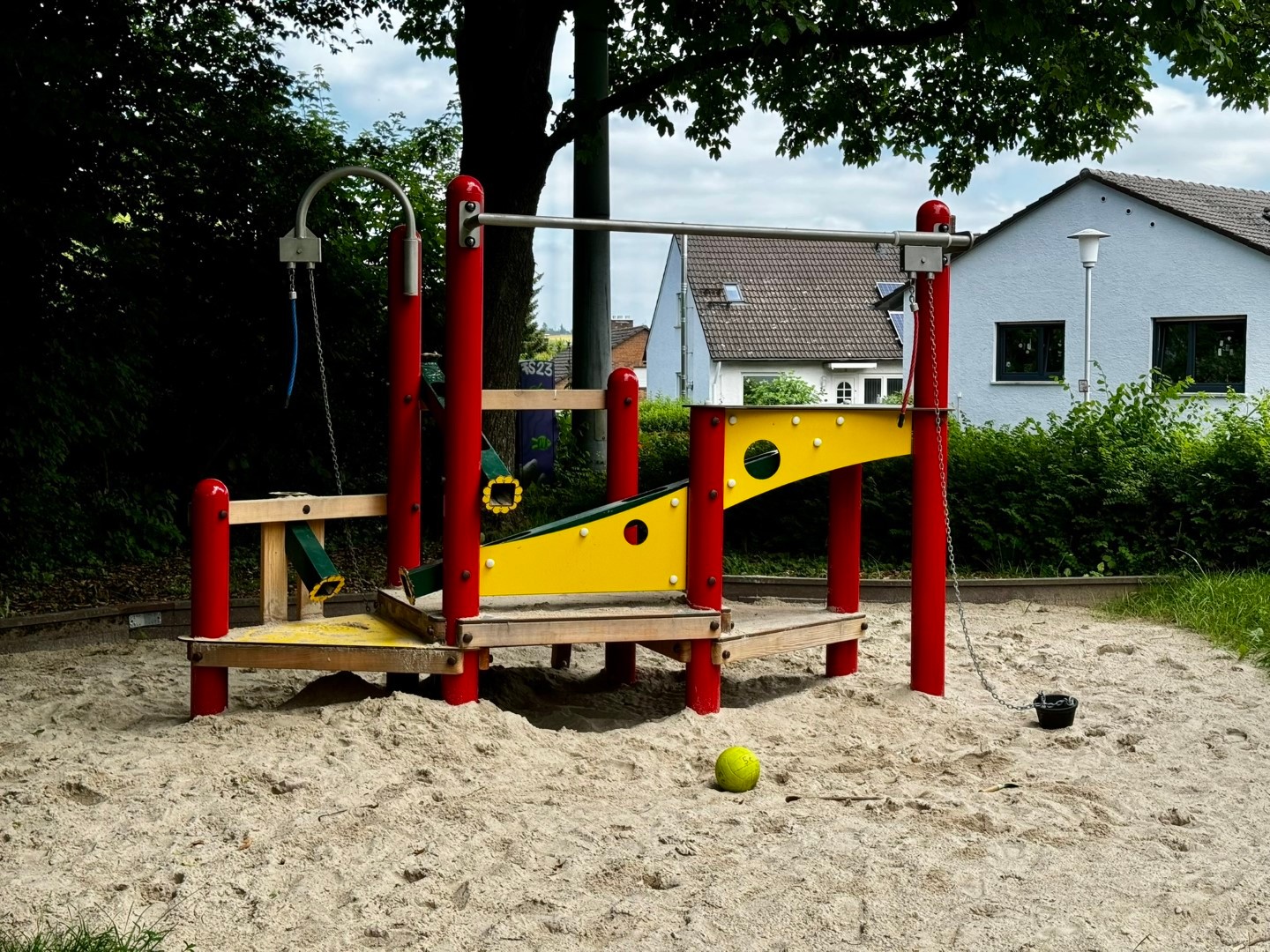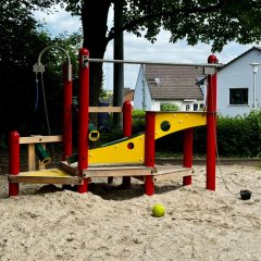 Ausstattung: Sandkasten, Tischtennisplatte, Schaukel, Turmrutschbahn, Wippe