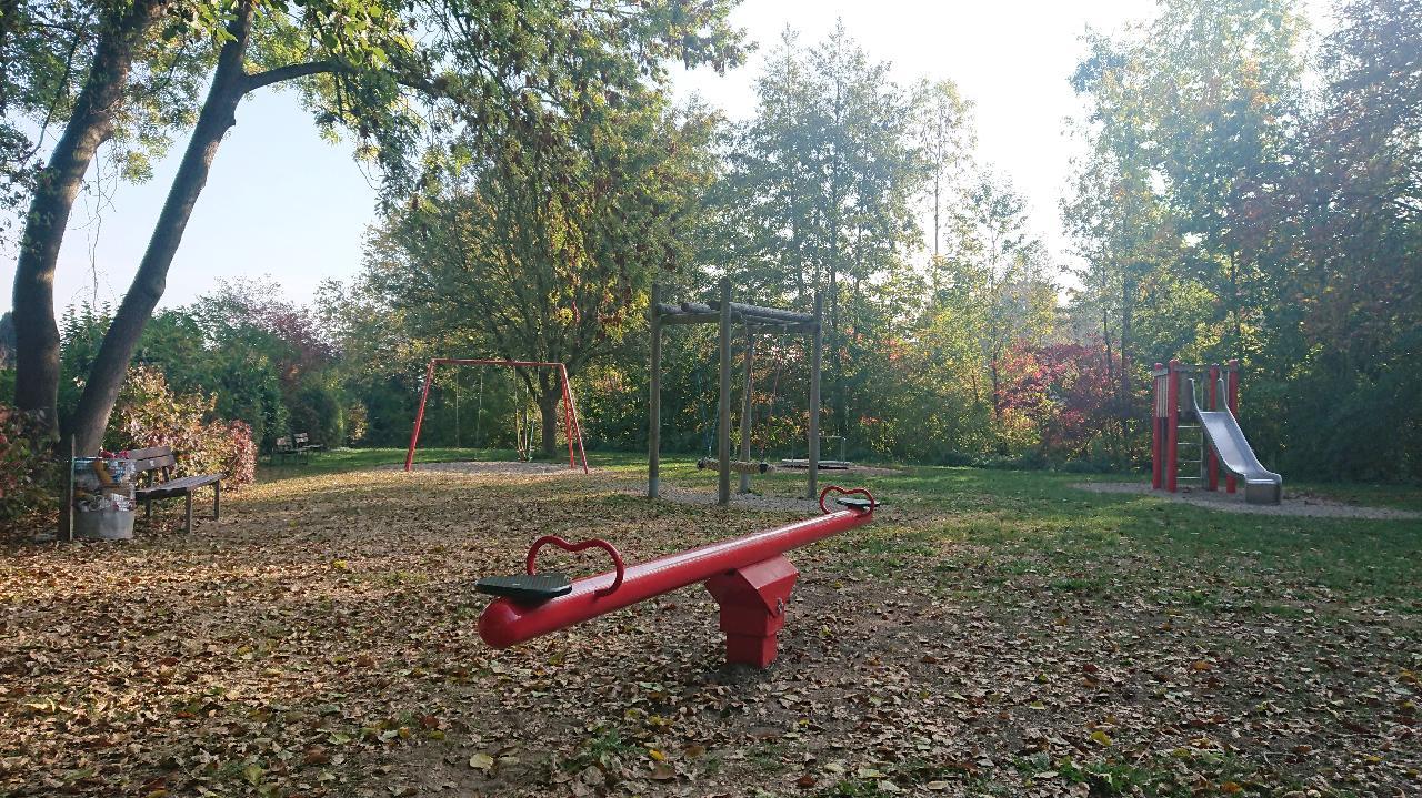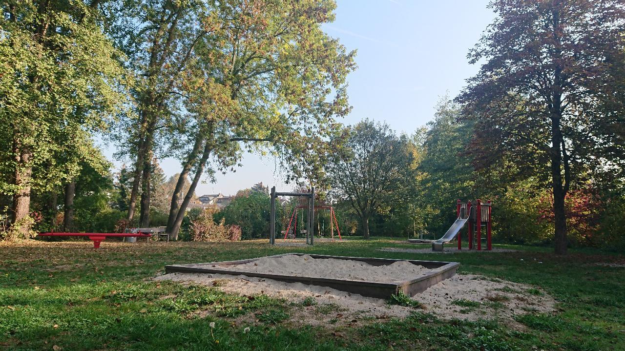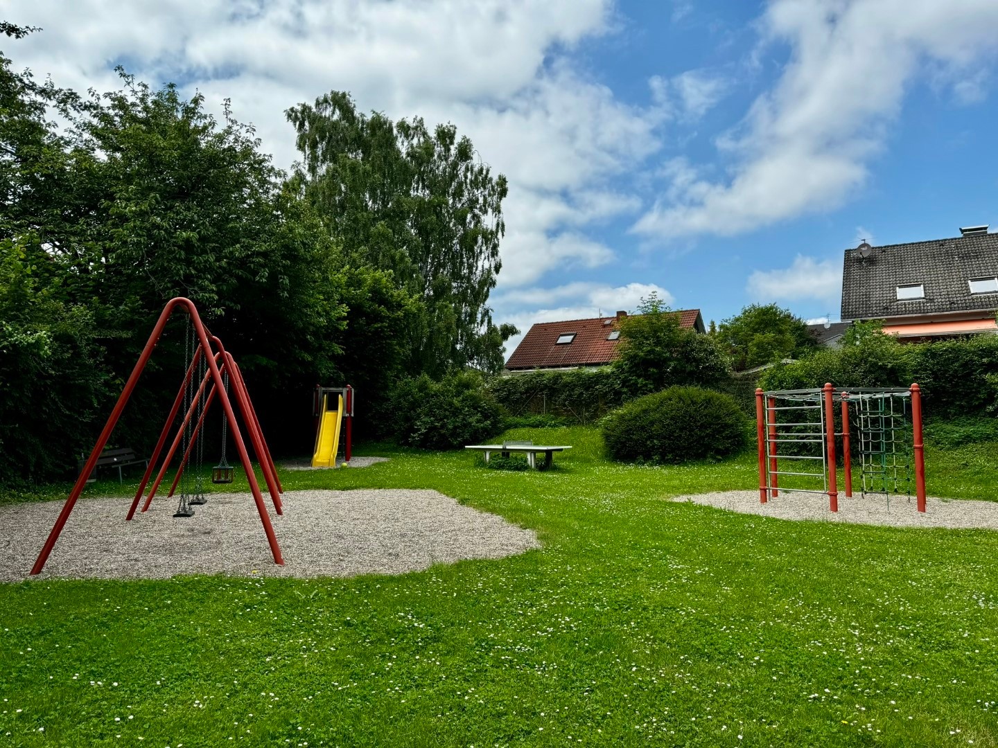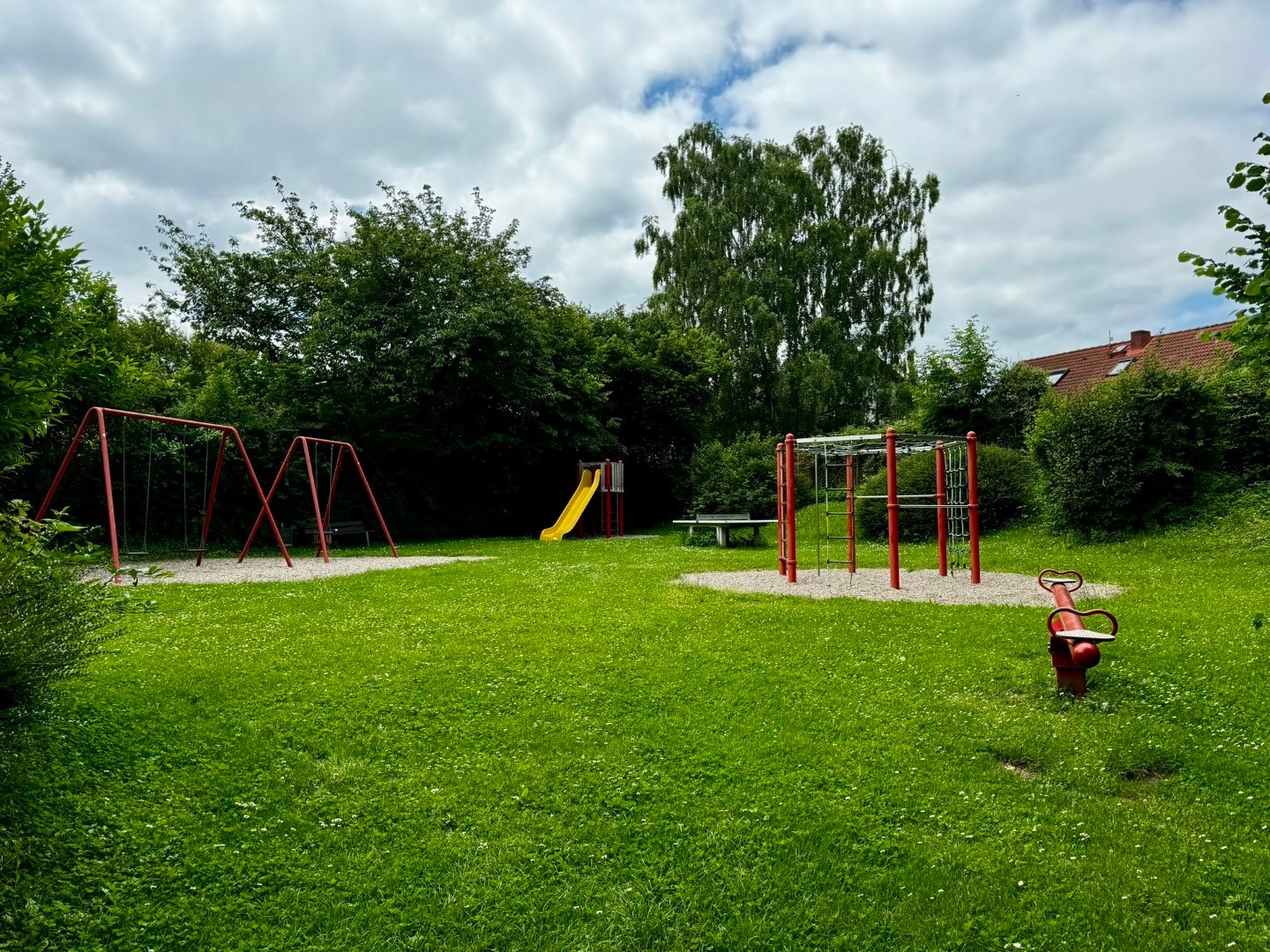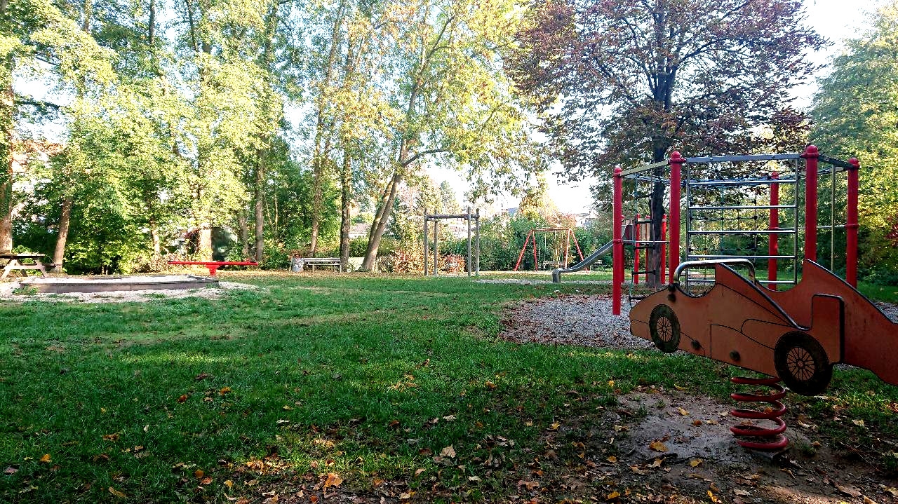 Ausstattung: Sandkasten, Klettergerät, Karussell, Tischtennisplatte, Schaukeln, Turmrutschbahn, Wippe, Bänke