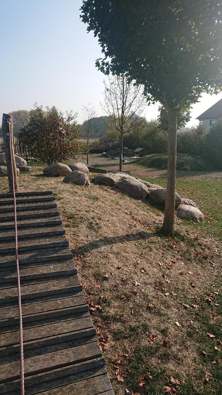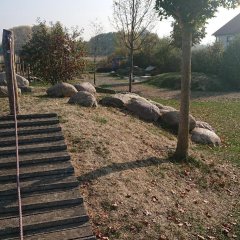 Ausstattung: Spielhaus, Sandkasten, Seilbahn, Turmrutsche, Vogelnestschaukel, Trampolin, Wippe, Fußballtor, Holz-Seilparcour, Holz-Kletter-Stämme, Kletterrampe, Findling-Kletter-Hügel
