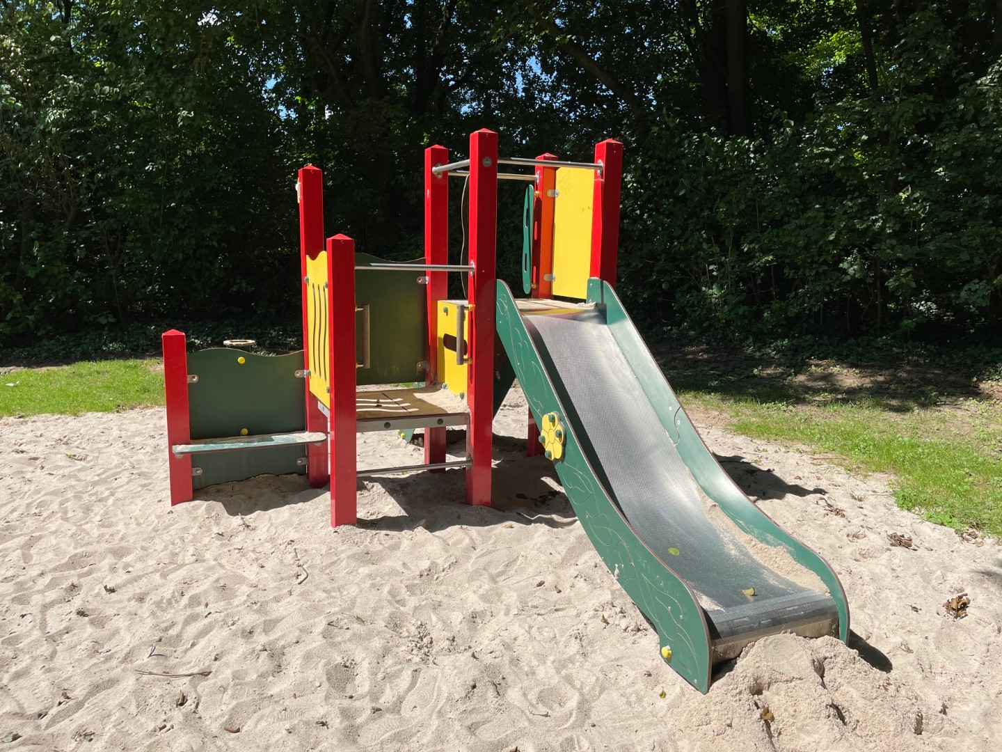 Ausstattung: Sandkasten, Tischtennisplatte, Schaukel, Turmrutschbahn, Wippe