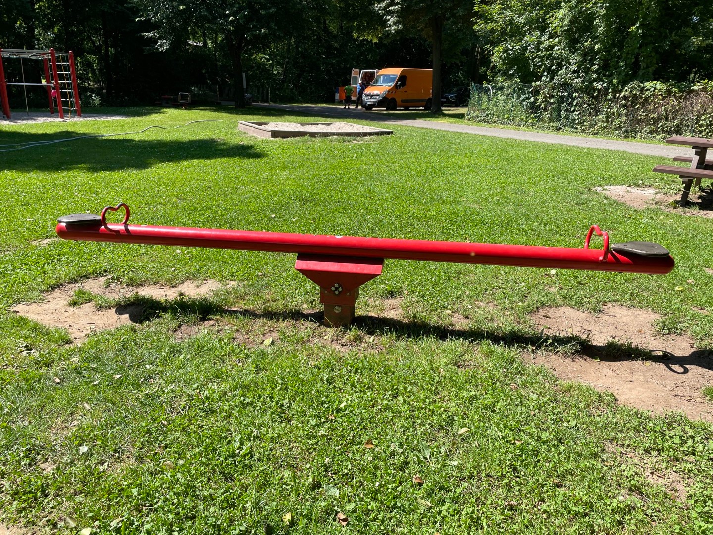 Ausstattung: Sandkasten, Seilbahn, Tischtennisplatte, Schaukel, Schwingtier, Reck, Karussell