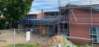 Die neuen Fenster wurden eingebaut. Momentan wird die Fassade gedämmt und anschließend verputzt. Die Dachflächen werden momentan erneuert.